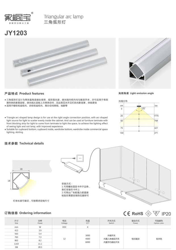 三角弧形灯设计为两块直角连接处使用,弧形面光源,使光线向柜内均匀散发开来,亦可应用于有前眉挡条的家具层板,使光线从层板上方照亮空间,且达到见光不见灯的光影效果,体验更佳