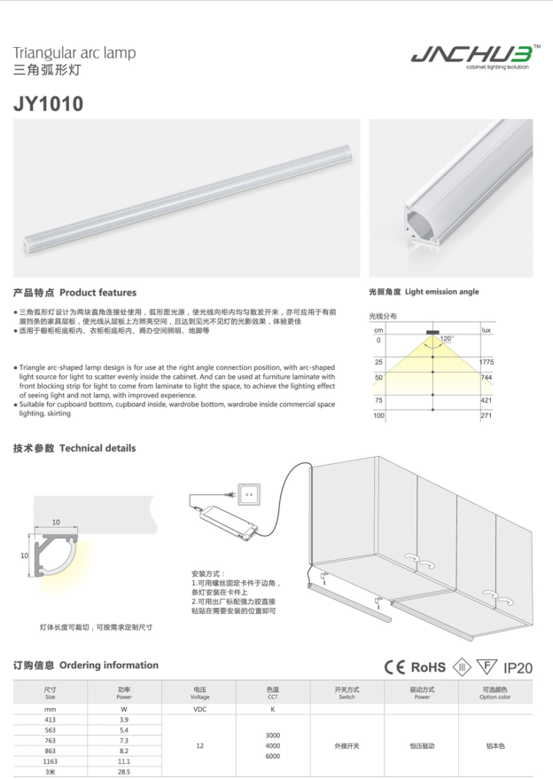 三角弧形灯设计为两块直角连接处使用,弧形面光源,使光线向柜内均匀散发开来,亦可应用于有前眉挡条的家具层板,使光线从层板上方照亮空间,且达到见光不见灯的光影效果,体验更佳