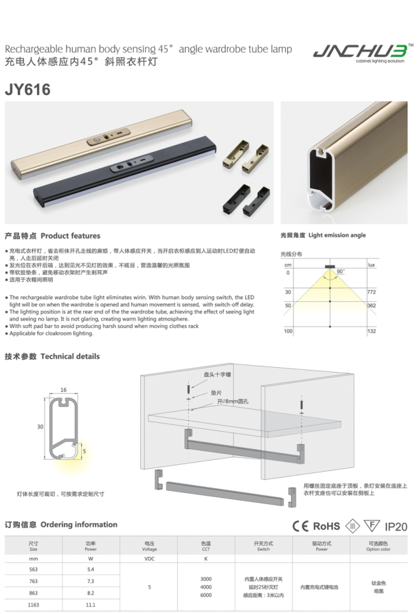 > 充电人体感应内45°斜照衣杆灯-JY616-1