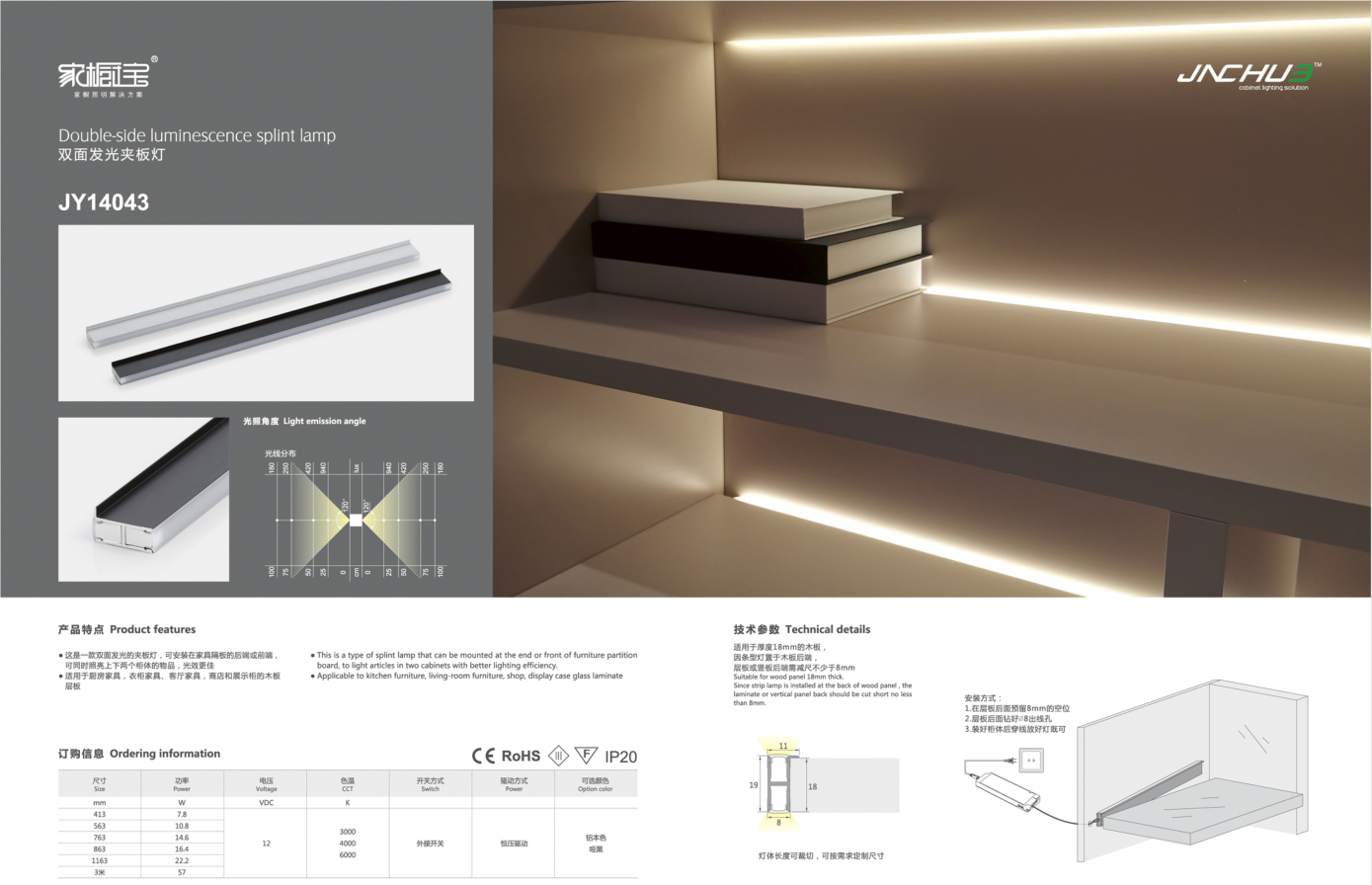 这是一款双面发光的夹板灯,可安装在家具隔板的后端或前端,可同时照亮上下两个柜体的物品,光效更佳
